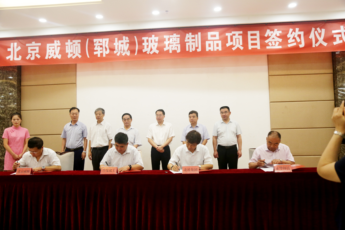 北京玻璃集團(tuán)公司,北京威頓玻璃制品有限公司,鄆城魯發(fā)化工,鄆城正華玻璃四方代表共同進(jìn)行了簽約。